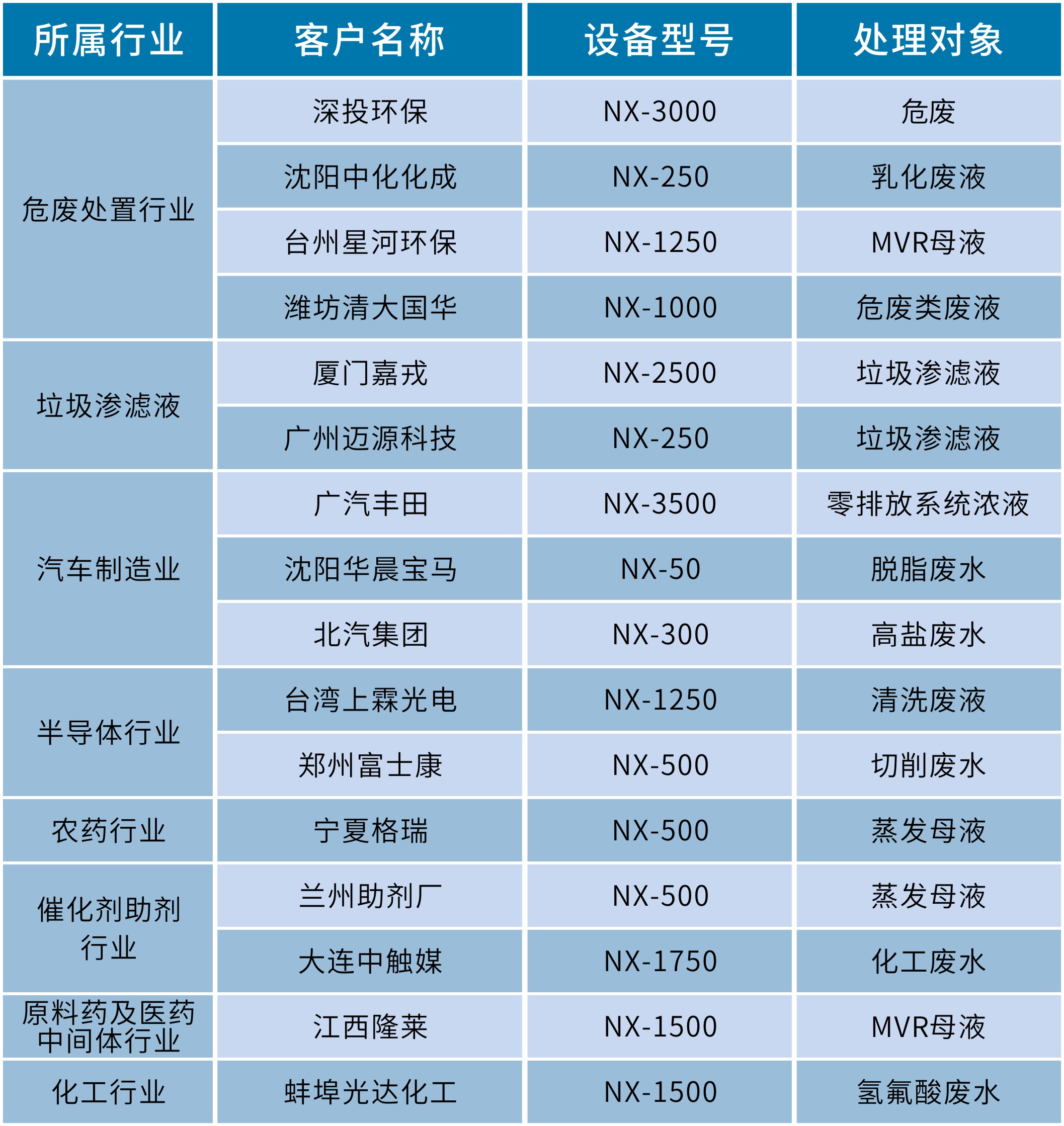 國內(nèi)超過120個(gè)案例,涵蓋多個(gè)行業(yè),包括危廢處置行業(yè)、化工行業(yè)、醫(yī)藥行業(yè)、汽車制造行業(yè)、垃圾滲濾液處理等等